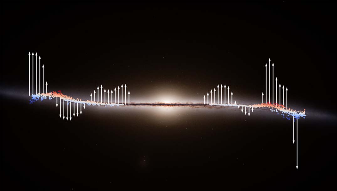 The motions of the stars are made visible with the white arrows in the edge-on image of the Milky Way above. What can be noticed, is that the wave pattern of the vertical motions (represented by the arrows) is slightly shifted horizontally relative to the wave pattern formed by the star’s vertical positions (indicated by the red/blue colours).