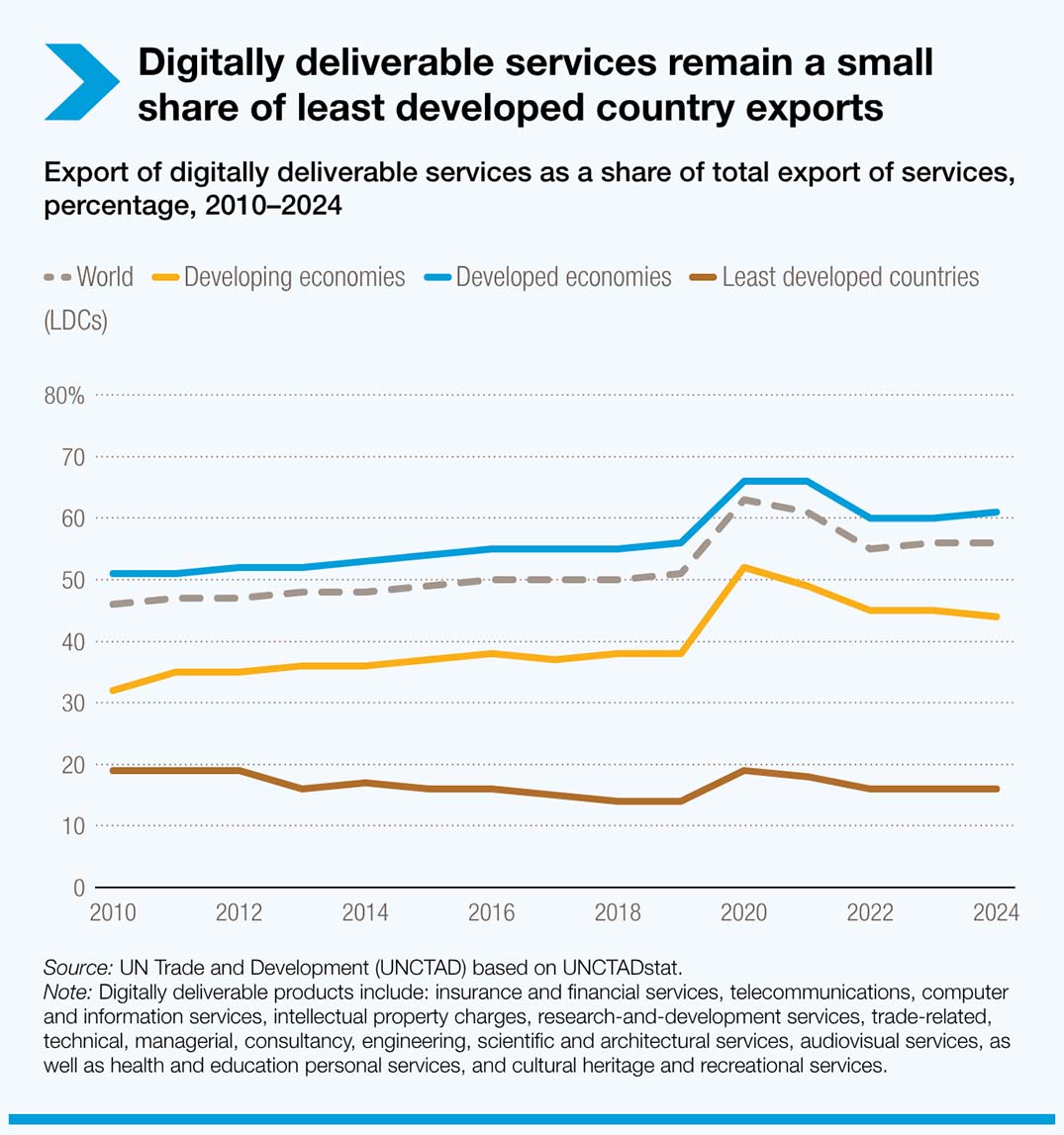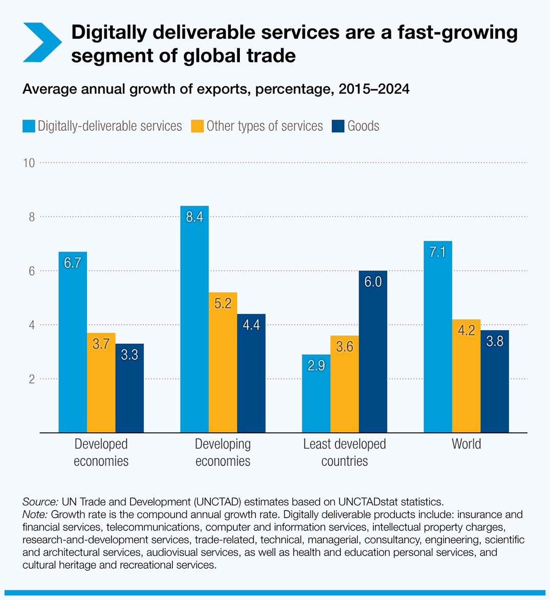 Meanwhile, new barriers are emerging as digital trade rules tighten. Closing the digital divide – through infrastructure, skills and supportive regulation – will be critical if developing countries are to benefit from the fastest-growing segment of global trade.