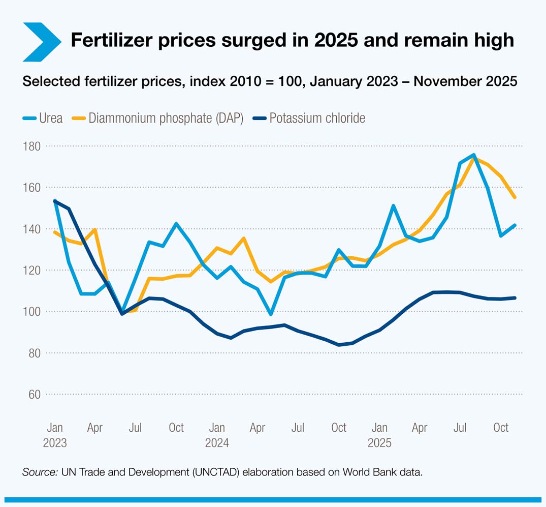- Fertilizer prices surged in 2025 and remain high, raising production costs.