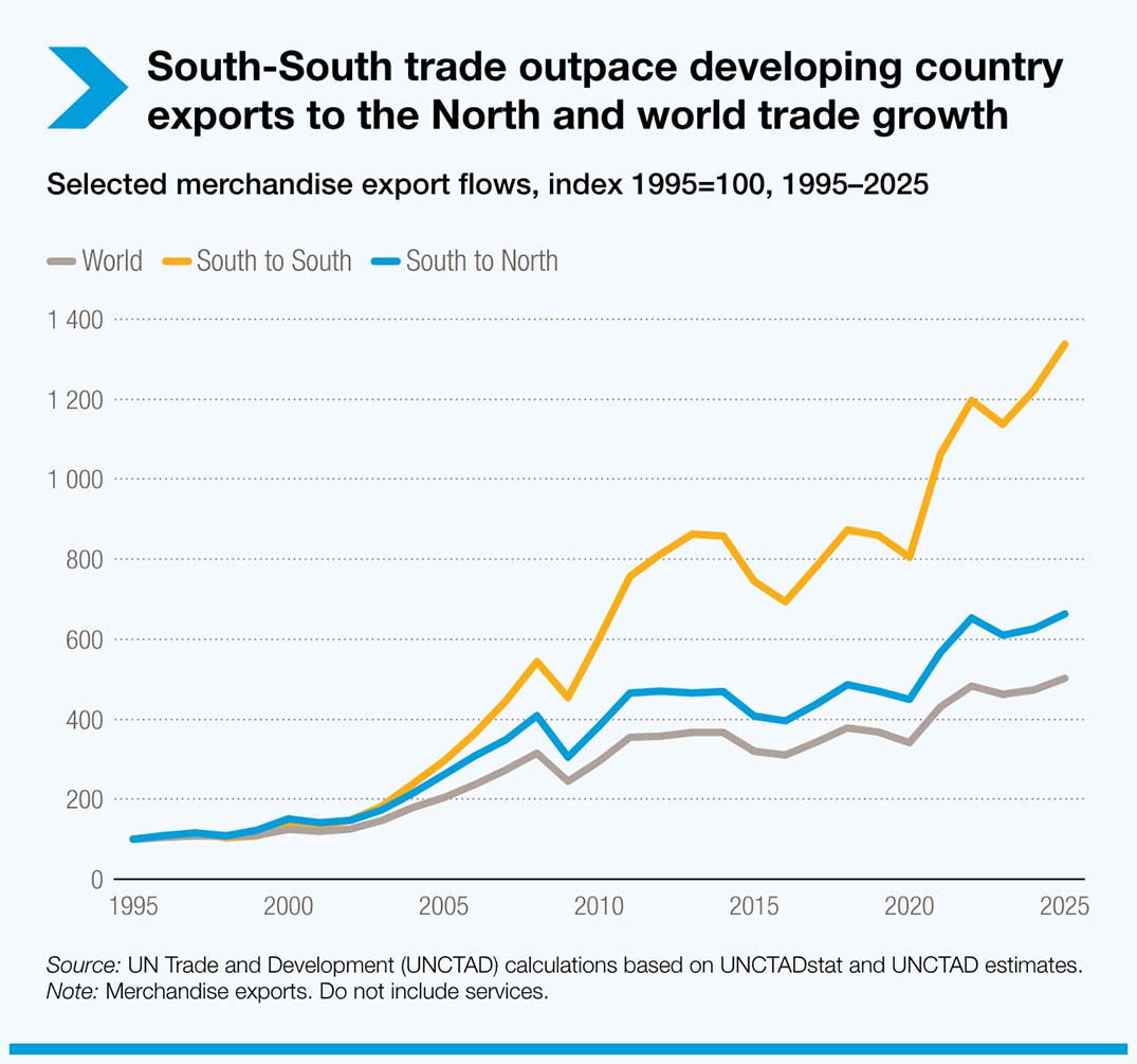 Between 1995 and 2025, South–South merchandise exports surged from about $0,5-trillion to $6,8-trillion. Today, 57% of developing-country exports go to other developing economies, up from 38% in 1995.