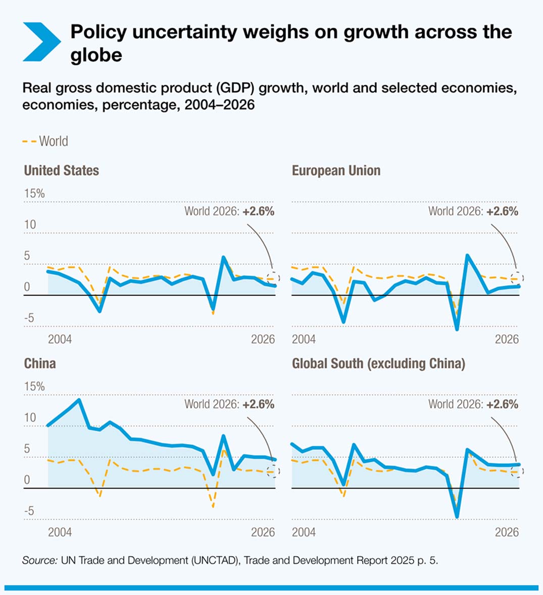 As demand growth weakens in advanced economies, South–South trade is likely to expand further. Strengthening regional and interregional links – especially between Africa and Latin America – could boost resilience across global trade networks.