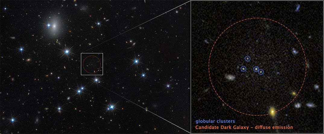 Detecting such faint galaxies is extraordinarily difficult. Using advanced statistical techniques, David Li of the University of Toronto, Canada, and his team identified 10 previously confirmed low-surface-brightness galaxies and two additional dark galaxy candidates by searching for tight groupings of globular clusters — compact, spherical star groups typically found orbiting normal galaxies.