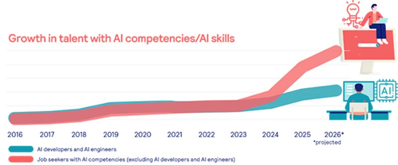 However, even then there was 98% alignment in the growth of non-tech talent with AI competencies and growth in AI Developers and Engineers – suggesting many professionals were already familiarising themselves with AI applications.