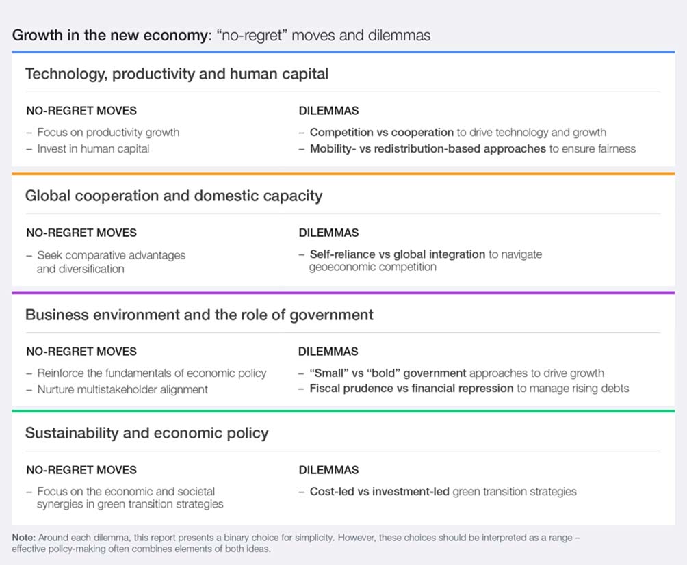 • Business environment and the role of government: In the new economy, reinforcing the fundamentals of economic policy – including credible institutions, high-quality infrastructure and macroeconomic stability – and strengthening multistakeholder alignment continue to be winning strategies. The role of government in economic transformation can range from minimal to more expansive, while policy-makers face hard choices to manage debt levels, shifting between greater fiscal prudence and forms of financial repression.